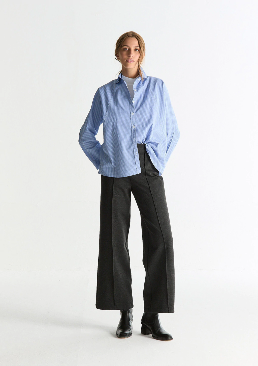 - Cuello camisero con botón en punta de cuello