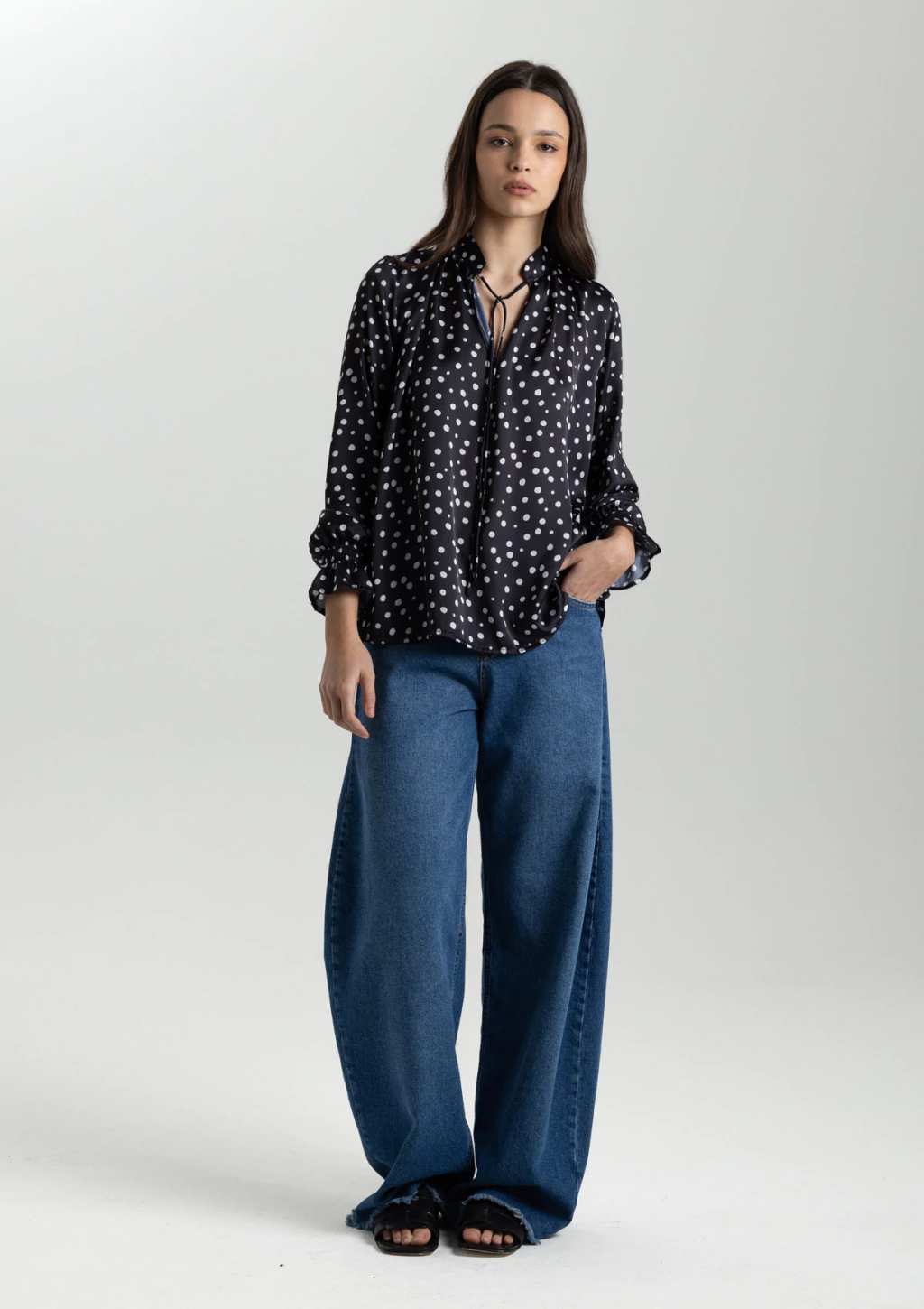 Una prenda sofisticada y versátil de carácter elegante y atemporal que no puede faltar en tu armario esta temporada. Su detalle de cuello mao con lazo la convierte en una prenda única y con personalidad. Tiene un tejido fluido y estampado.