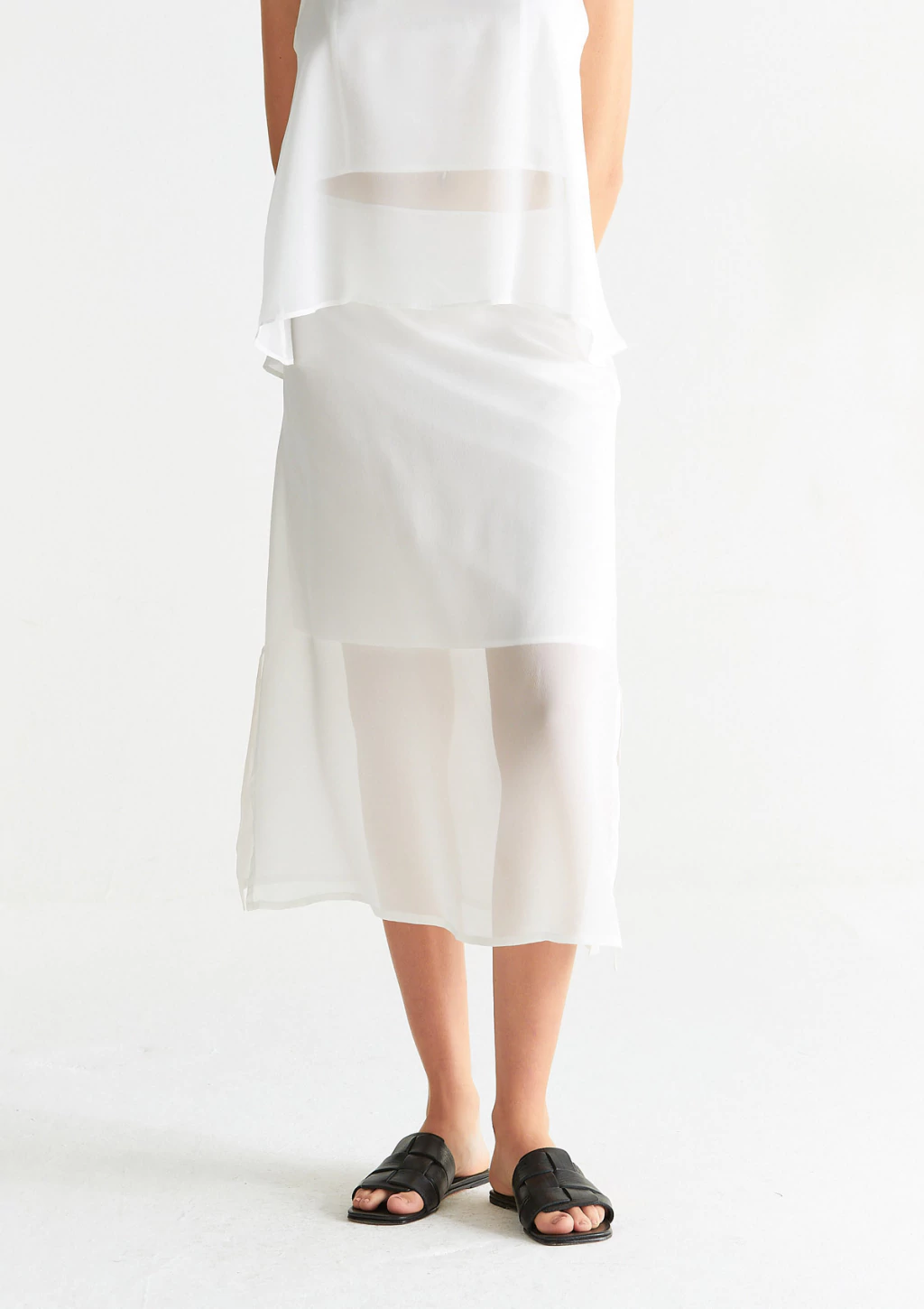 Tejidos refinados y volúmenes etéreos definen el encanto femenino de la falda. La textura fina y sutilmente crujiente de la refinada seda acompaña las líneas ligeras de la falda, mientras que el forro en voile permite disimular la elegante transparencia del tejido.