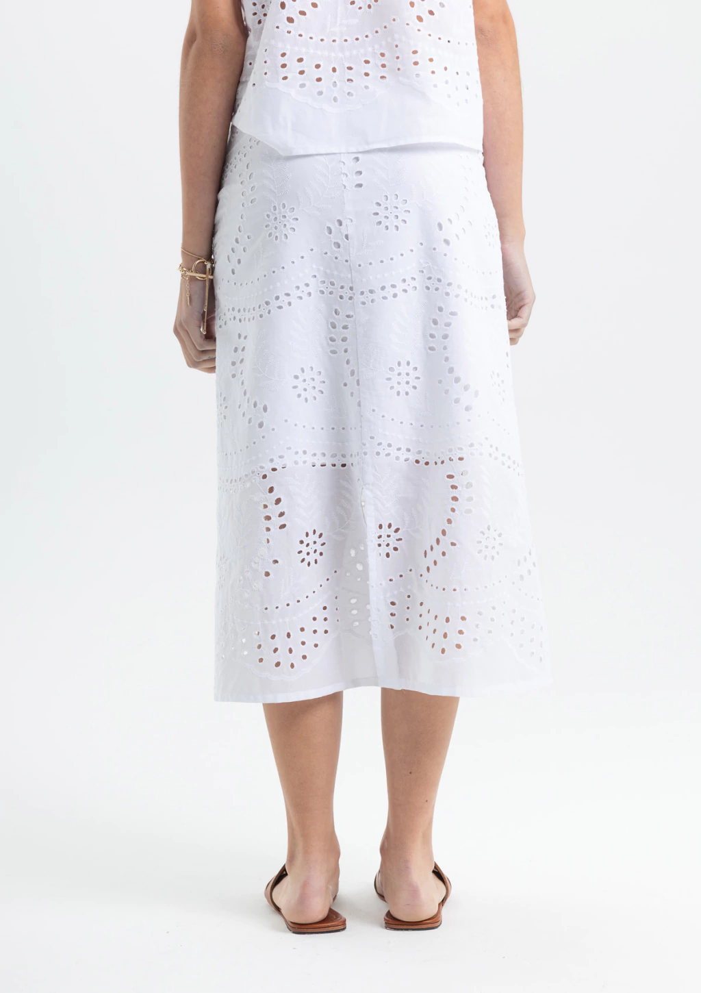 Simple y elegante, esta falda de broderie presenta un tejido texturizado sólido. Combinala con tacones y accesorios dorados para un look de noche, o con sandalias planas y una bolsa de yute para un estilo más relajado de día. No te puede faltar en tu armario esta temporada.