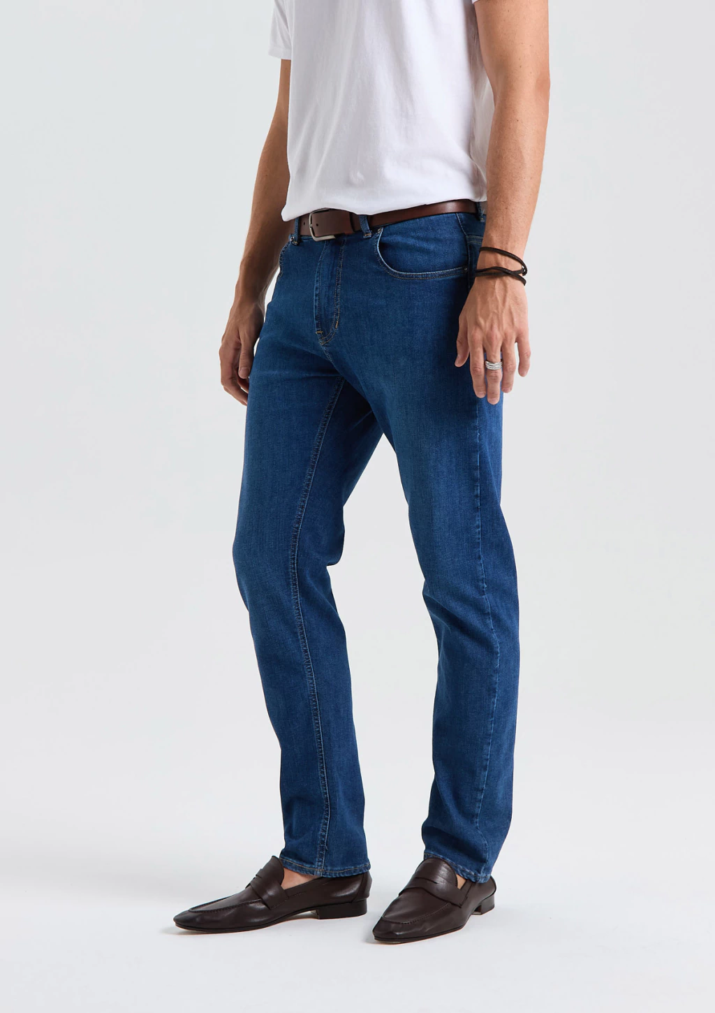 Estos jeans azules de algodón elastizado están hechos de un denim súper suave y liviano para que puedas llevarlos todo el día sintiéndote cómodo con estilo. Realizados en corte straight fit, con un lavado azul levemente desgastado y costuras a tono, logran darle a tu look la modernidad y sobriedad que buscas. Llevalos con polera y sweater, dándole el toque final con una campera de cuero.