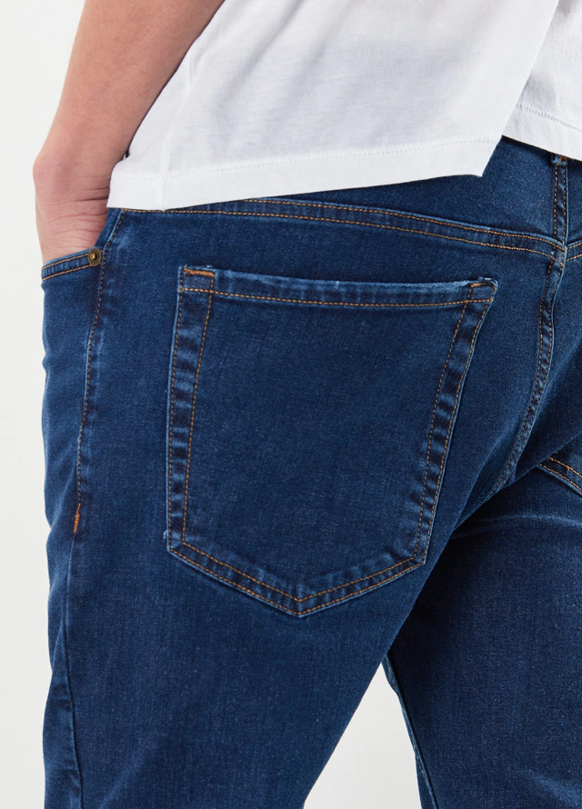 Estos jeans azul oscuro de algodón elastizado están hechos de un denim súper suave y liviano para que puedas llevarlos todo el día sintiéndote cómodo con estilo. Realizados en corte slim fit, con costuras en color galletita logran darte el toque sofisticado que querés para tus conjuntos. Llevalos con un sweater escote V o cuello redondo.